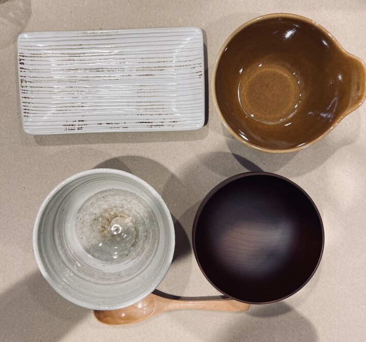 マットな木目調などの素材に、陶器などの艶のある質感を組み合わせることで、