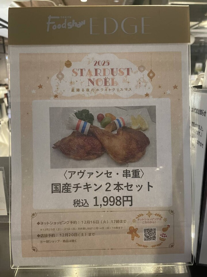 SHOP アヴァンセ・串重 店舗情報はこちら 2025.10.01 クリスマスチキンセットご予約承り中 クリスマスにぴったりなチキンセットをご予約承り中です。お得な国産チキン2本セット!店頭予約12月20日まで!ぜひご予約お待ちしております。