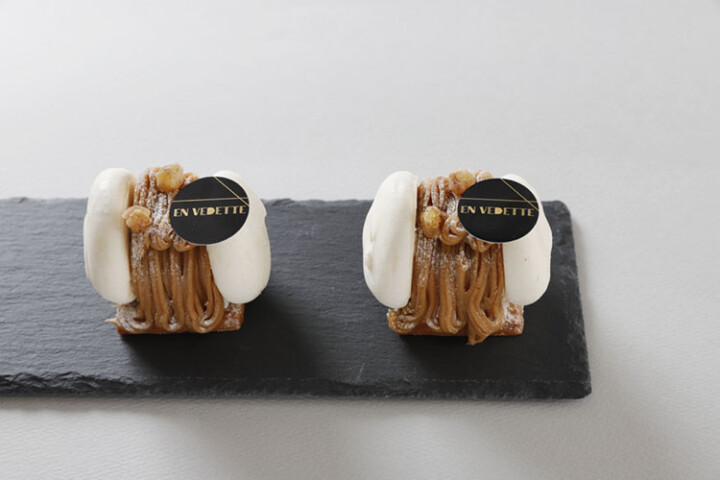 マロンクリームに無糖の生クリームとマロングラッセ、ガトーバスクを合わせ、メレンゲでサンドしました。