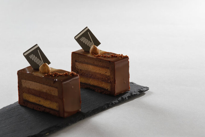 濃厚なチョコレートムースに、アプリコットのジュレとガナッシュ、ヘーゼルナッツムース、ココアサブレ、フィナンシェ生地を合わせました。