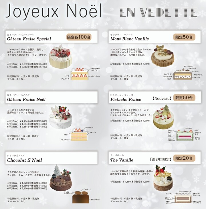 新作の『ピスターシュ フレーズ』、渋谷店限定&新作の『テ・バニーユ』を含めた6種類でご用意しております🎄