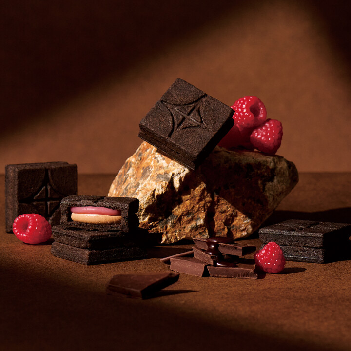 ラズベリーの甘酸っぱさと、 チョコレートの濃厚なコクを閉じ込めたキャラメルとクリームを香ばしく、ほろ苦いココアクッキーで丁寧に挟みました。