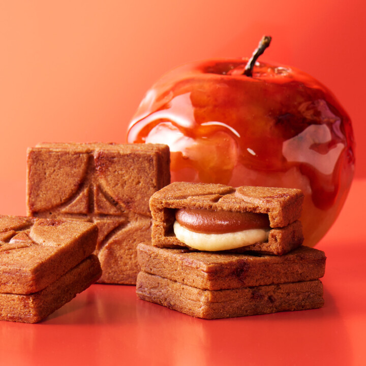 カラメルチップを練り込んだ香ばしいサクサククッキーで、りんごが香るビターキャラメルとカスタードクリームを挟みました。